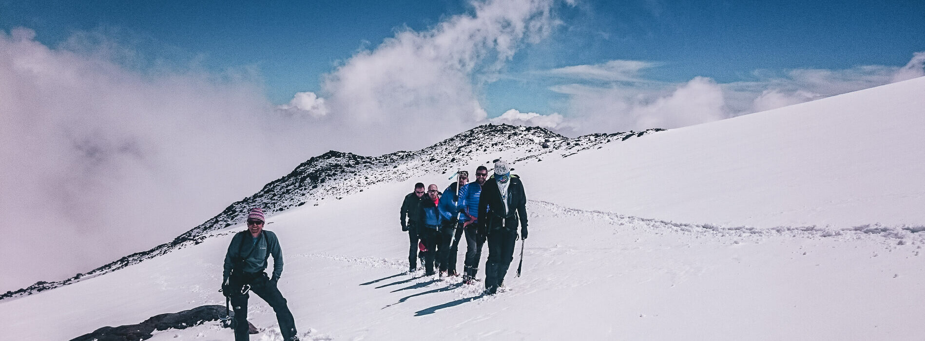After a brief stop to adjust clothing for the cold of higher altitudes, grab a snack, and add goggles to protect us from the sun and the spindrift, we continued on the long traverse across the upper glacier towards the saddle that separates the East and West summits. Passing the 5000m mark for the first time the altitude starts to bite and the saddle seems to get no closer despite the upward march. The weather closed in with clouds blowing down from the summit obscuring the view. Only the merciful easing of the angle beneath our crampons told us that we had reached the saddle. We were about to begin the final phase of the climb.