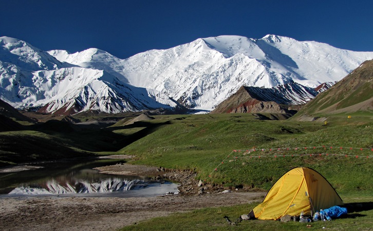We ventured out for dinner and a few beers that night and headed for base camp the next morning. It was about a four-hour drive through the Kyrgyz countryside and steppe before we reached base camp. The day was beautifully clear and we could see the summit towering above us in the distance. Only mildly daunting. We met with our Russian guide Nikolay who informed us that we looked strong and that we were the only group this season that had gone for a hike on their arrival at Base Camp – a high compliment from a guy who’s a five-time Snow Leopard!