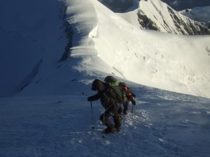 A later start of 8 am the next morning saw us emerge from our tents to see the remnants of an avalanche that had passed very close to Camp 2 during the night. We made some coffee and porridge and got on our way to Camp 2.5. We took only the minimum as we felt we had brought too much to Camp 2 the day before. It was a steep climb out of camp but I was feeling much stronger having rested well. The day’s ascent wasn’t long, only three or four hours until we stopped just below the steep climb to Camp 3 where we constructed our own campsite in the snow.