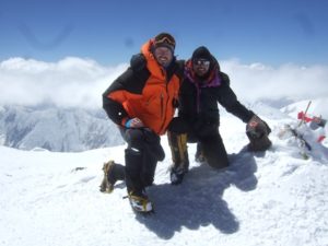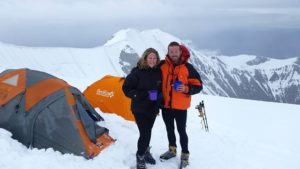 After a bad night’s sleep, the team got ready for the ascent the next morning, packing up just one tent to bring to Camp 3. It’s a steep climb. We managed it in about two hours and set up the tent, keeping our fingers crossed it would still be there when we returned, anchored with ice axes, blizzard stakes and snow pickets. Our Russian guide Nikolay informed us that there would be time to make it back to Camp 1 today if we pushed on. We are on – we ploughed down the hill, stopping for a quick break of cheese and crackers at Camp 2 where we deposited some equipment we wouldn’t need further down the mountain before pushing on with the long trek back to Camp 1. Not as tiring as going up, but still tiring.