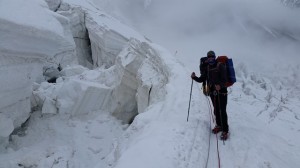 I also got my first experience of crevasses – scary stuff! Even with a blanket of cloud over us, it was hot. And a bit burny. We learnt a good lesson about the power of the sun’s rays both from above and below reflecting up from the glacier. The team ascended about 300m up the glacier before turning back and crossing the moraine to Camp 1, sweaty and tired but ready to depart the next morning at 4.30 am.