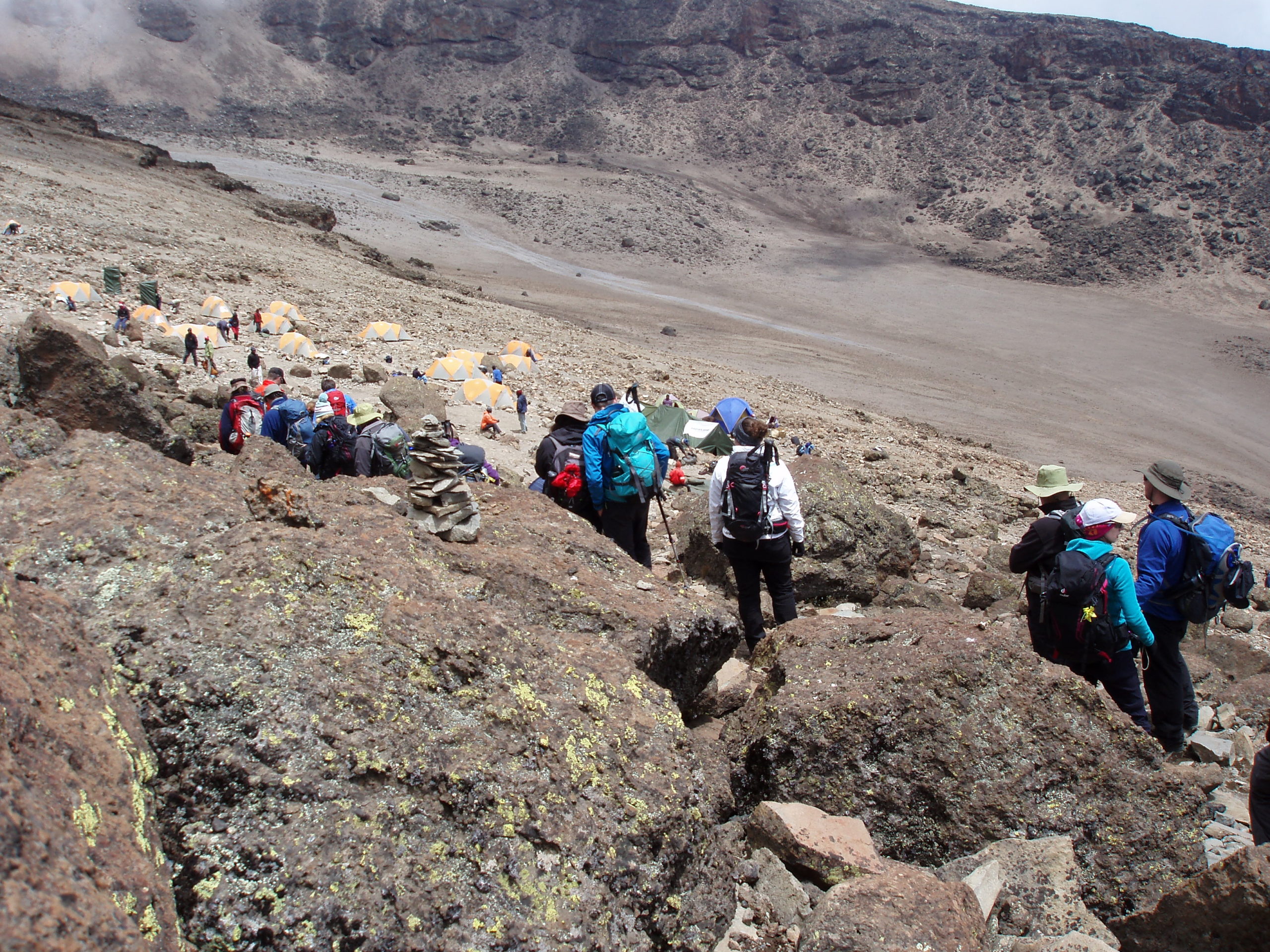 In addition to the porters and to make sure we stayed on track we also had a team of nine local guides, this was in addition to our two very experienced and competent Irish guides. The job of the guides is to look after the clients, keep us entertained and to do whatever they can to get each person safely to the summit and back down again. Each of the guides had previously served their time as a porter, learning the mountain, gaining fitness and earning the trust of a company which would then pay for them to train as a guide. A rigorous six month training course which teaches them all there is to know about the mountain and how to safely lead people to the summit culminates in a demanding four day assessment which includes a pass-fail time trial from high camp to the summit, a test of fitness and endurance. I know one lady in our group who also wanted to try out this challenge, my wife the guide in a former life.